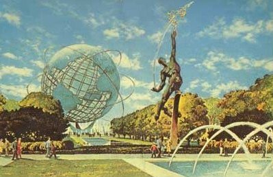 1964, New York, Plaza of the Astronauts (postcard), Unisphere & The Rocket Thrower